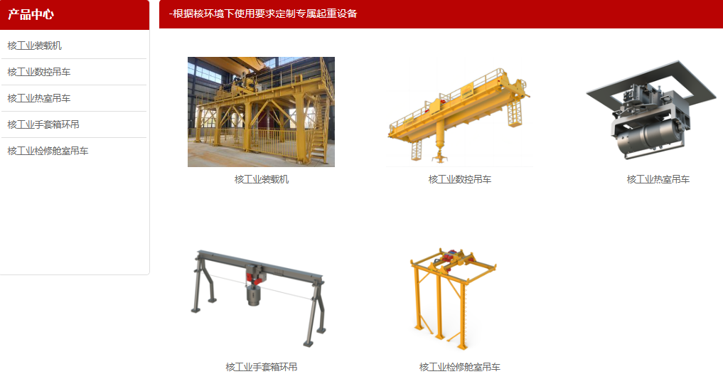公司产品面向特殊环境物料搬运领域,参与过中核四 0 四、中核第二研究院、中国原子能院、中核第四研究院、中国核电工程公司等多项核工业相关项目。有足够的经验和专业知识,足以对任何起升设备和各种形式吊车系统提供咨询、设计、制造、安装和运行维护服务。