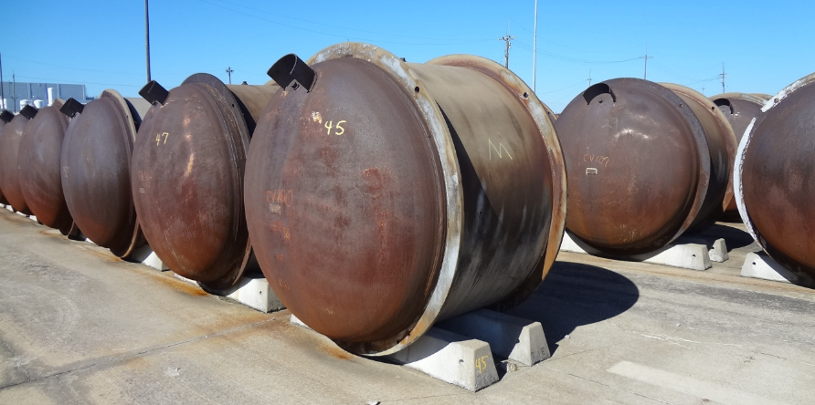 六氟化铀气瓶矗立在帕迪尤卡核电站的气瓶堆放场。(图片:美国能源部)
