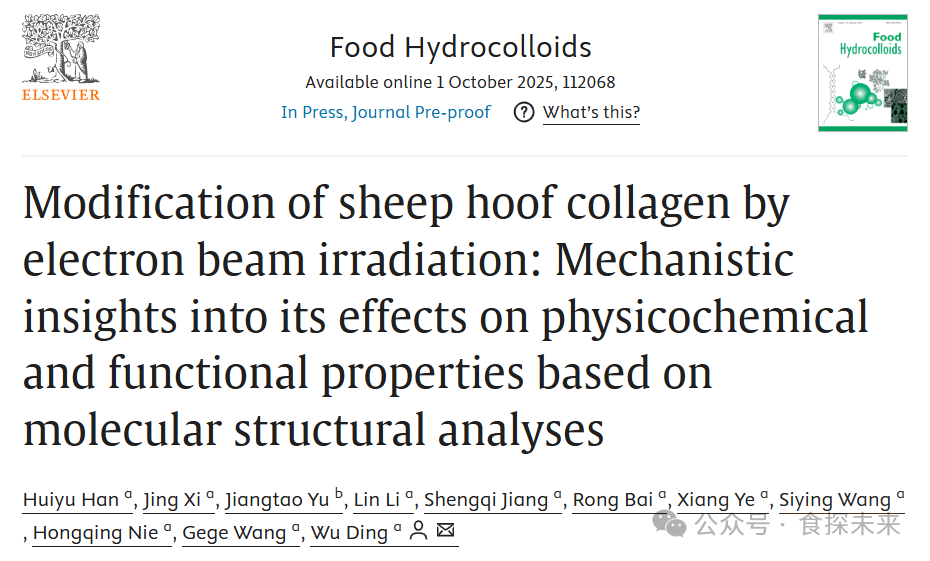 近日,西北农林科技大学丁武教授团队在《Food Hydrocolloids》期刊(一区,IF:12.4)上发表了题为《Modification of sheep hoof collagen by electron beam irradiation: Mechanistic insights into its effects on physicochemical and functional properties based on molecular structural analyses》的研究性论文。该研究以羊蹄胶原蛋白为对象,采用 0-10 kGy 不同剂量电子束辐照(EBI)处理,通过 SDS-PAGE、FT-IR 等分子结构分析手段,探究 EBI 对其理化及功能特性的影响机制。研究发现,EBI 可诱导胶原变性、β/γ 链降解形成小分子物质,6 kGy 剂量效果最优,能显著减小胶原粒径、提升溶解度(63.55%)、表面疏水性及游离巯基含量,同时大幅改善乳化活性(20.36 m²/g)、乳化稳定性(89.48%)与流变性能;但 EBI 会破坏胶原凝胶网络,降低其质构特性与保水性(结合水向自由水转化),高剂量还会引发胶原低聚化。这一发现为胶原蛋白绿色改性提供新途径,也为羊肉加工副产物高值化及食品用胶原基原料开发提供理论支撑。