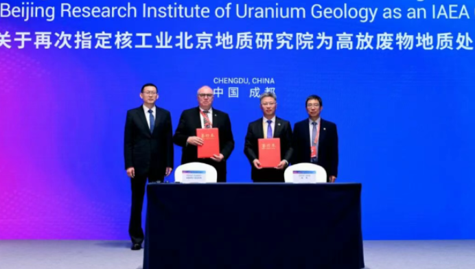 2025年10月15日,由中国国家原子能机构主办、中国核工业集团有限公司承办的国际原子能机构(以下简称“IAEA”)第30届聚变能大会中国边会“核聚未来—核能‘三步走’创新进展”在成都顺利召开。会议期间,在中国国家原子能机构副主任刘敬、中核集团副总经理辛锋的共同见证下,IAEA副总干事米哈伊尔·楚达科夫与核工业北京地质研究院(以下简称“核地研院”)党委书记陈亮正式签署《国际原子能机构关于再次指定核工业北京地质研究院为高放废物地质处置协作中心的协议》并完成授牌。