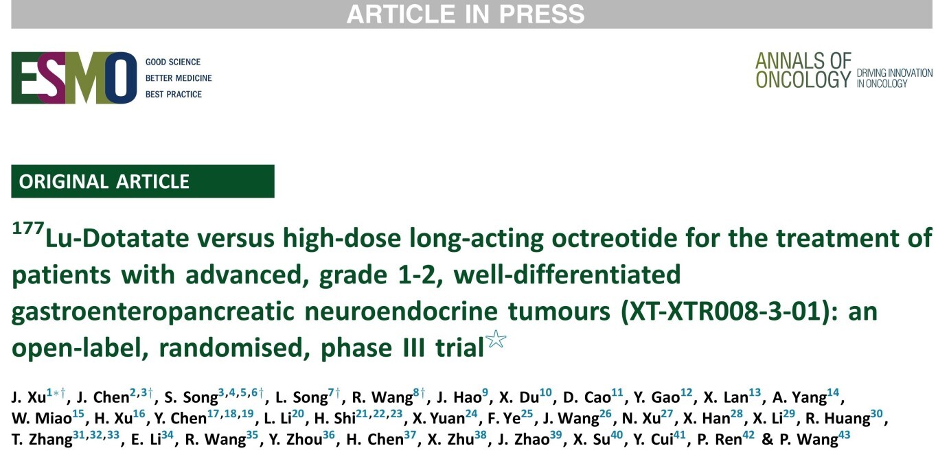 近日,先通医药自主研发的放射性核素治疗药物XTR008中国III期临床研究成果已正式于肿瘤学国际顶级期刊Annals of Oncology(影响因子:65.4)发表。同时,该研究最新分析结果成功入选本届ESMO大会LBA(Late-Breaking Abstract,最新突破性摘要),并在ESMO年会优秀论文会议(Proffered Paper Session)上,由中国人民解放军总医院刘容锐教授作口头报告,向全球肿瘤学界展示XTR008作为单药治疗神经内分泌肿瘤的卓越临床表现,引起了与会专家和学者的广泛关注和热烈讨论。这是国内少数实现ESMO大会与国际顶级学术期刊同期发布的研究成果之一,充分彰显了XTR008在神经内分泌肿瘤治疗领域的重大价值与国际影响力。