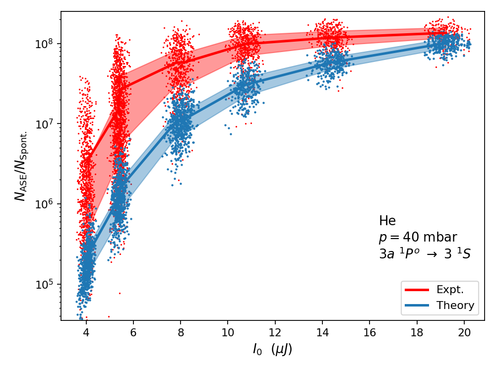 在 40 mbar 气体压力下,不同 FEL 泵浦脉冲能量 I0时,He 中双激发态最强自发辐射通道的 ASE 放大因子