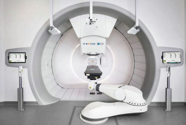 中广核和质®质子治疗系统配备高精度、高效率的360°旋转机架,实现束流入射角度自由选择,避免治疗过程中反复移动治疗床,提高治疗精度和效率;束斑尺寸直径仅3毫米,能更精准地勾勒肿瘤靶区,实现对肿瘤靶区的超精准打击,更好地保护正常组织和器官,提升治疗精度;配置的30×40厘米超大照射野能有效减少治疗过程中照射野拼接,减少患者单次治疗时间,提升治疗效率;和质®还能实现治疗室的灵活拓展,只需配置1台加速器,即可按医院需求灵活配置1间或多间治疗室,有效降低医院初始投资成本,推动我国质子治疗技术普及应用,让质子治疗技术造福更多肿瘤患者。