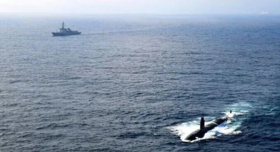 2023年7月29日,在济州以南海域,韩美海军实施联合反潜演习。“栗谷李珥”号宙斯盾驱逐舰在远处,“安纳波利斯”号核动力潜艇在近处