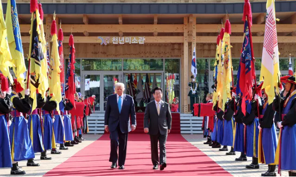 10月29日,在庆州国立庆州博物馆,韩国总统李在明和美国总统特朗普前往首脑会谈现场