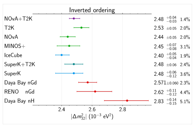 与其他实验测量结果相比,NOvA+T2K 联合分析振荡参数Δm232 的测量结果。颜色表示中微子源的类型(红色代表反应堆,蓝色代表大气,绿色代表加速器)
