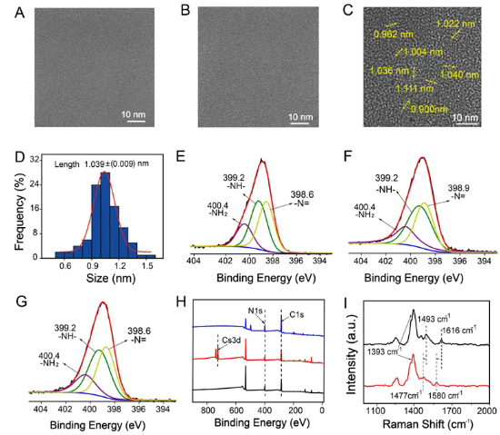图2. CIPF的TEM及XPS数据:(A)空白聚邻苯二胺,(B)铯结合的聚邻苯二胺,(C)CIPF的TEM图。(D)图2C中的粒径分布。(E)空白聚邻苯二胺,(F)Cs+结合聚邻苯二胺薄膜,(G)CIPF的N1s XPS数据。(H)空白聚邻苯二胺(蓝线)、Cs+结合聚邻苯二胺薄膜(红线)和CIPF(黑线)的XPS全谱数据。(I)加入(蓝线)和不加入(黑线)0.3 mM Cs+制备的聚邻苯二胺薄膜的拉曼光谱。