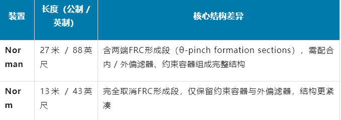 NORMAN最初的设计是在两个FRC两端分别设置θ箍缩区,使两个FRC在中央约束容器(CV)内形成、平移、碰撞、合并并达到热平衡。由此形成的FRC是注入中性束电离和捕获的理想靶。束流离子通过大轨道效应增强等离子体的稳定性,并通过产生快离子电流来维持等离子体约束。而NORM是NORMAN经过一次重大重构,移除了两个θ箍缩区形成的改进型装置。这种更紧凑的配置同样实现了启动和维持,其实验结果参数与Norman系统相似。以下是两者区别: