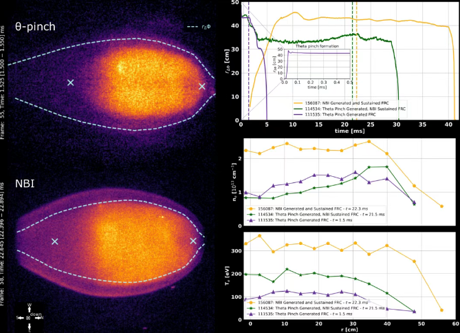 图片为中性束注入 (NBI) 和θ箍缩产生的场反转构型 (FRC) 平衡的比较。左图是高速分幅相机拍摄的氧离子(O⁴⁺)在650纳米波长处的发射图像,叠加了排除通量半径(excluded flux radius)和估算的X点(X-points)。电子密度(nₑ)和电子温度(Tₑ)较高的核心区域,发射强度最强。磁场轴指向北方,相机视角以径向为主,但从沿轴- 82厘米处朝向装置中平面拍摄;这种视角是导致 X 点看似不对称的原因。右图的上方图形展示了两种生成方式(及额外一种 “θ- 箍缩生成 + 中性束注入(NBI)维持” 方式,即Norman装置构型)下的等离子体排除通量半径(可作为分界面的替代指标)。