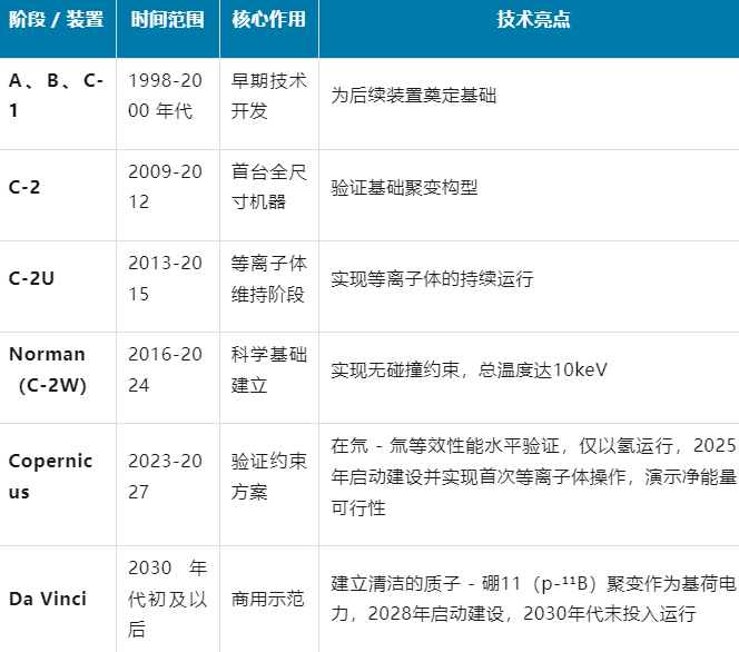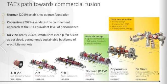 上面这幅图是TAE Technologies在2023年发布的 “商业聚变发展路径图”,清晰展示了其从早期研发到商用聚变能源的技术迭代与阶段目标: