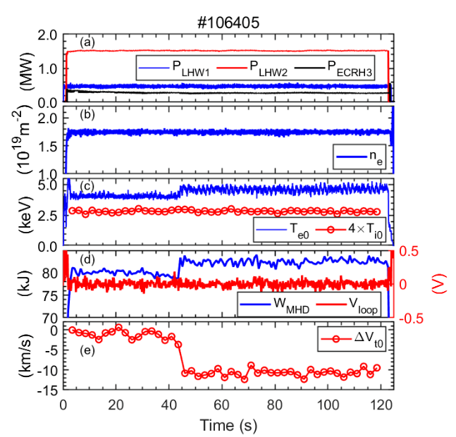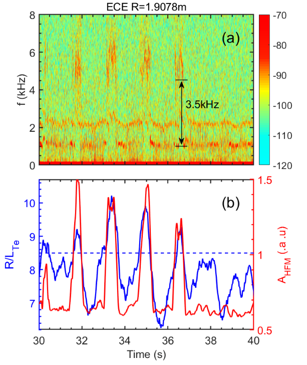 本研究聚焦于EAST装置上一次持续125s的典型长脉冲放电。研究发现,在放电初期,一个m/n=3/2撕裂模(TM)被激发并持续约42秒。尽管外部加热功率保持恒定,但通过低杂波电流驱动与等离子体极向磁场的非线性耦合,电流剖面发生了缓慢的自组织演化,导致磁剪切增强,最终使该撕裂模被自然抑制。撕裂模消失后,等离子体核心电子温度升高,约束性能得到改善。与此同时,研究团队观测到一种独特的不稳定性模式转换现象:一个m/n=1/1的长寿模(LLM)会与一个m/n=1/1高频模(HFM)交替出现。分析表明,当电子温度梯度超过阈值(R/LTe ~ 8.5)时,会激发由温度梯度驱动的HFM,其频率会随梯度“啁啾”变化,特性类似于漂移撕裂模,可能对维持核心输运垒起到关键作用。另外,研究通过实验与模拟相结合,证实这些MHD模式会通过“新经典环向粘性(NTV)”效应产生环向力矩。模拟显示,撕裂模会产生一个与等离子体自转方向相反的“刹车”力矩;当撕裂模消失后,这个力矩减小,导致等离子体核心旋转加速,这可能是约束改善的另一个关键物理因素。
