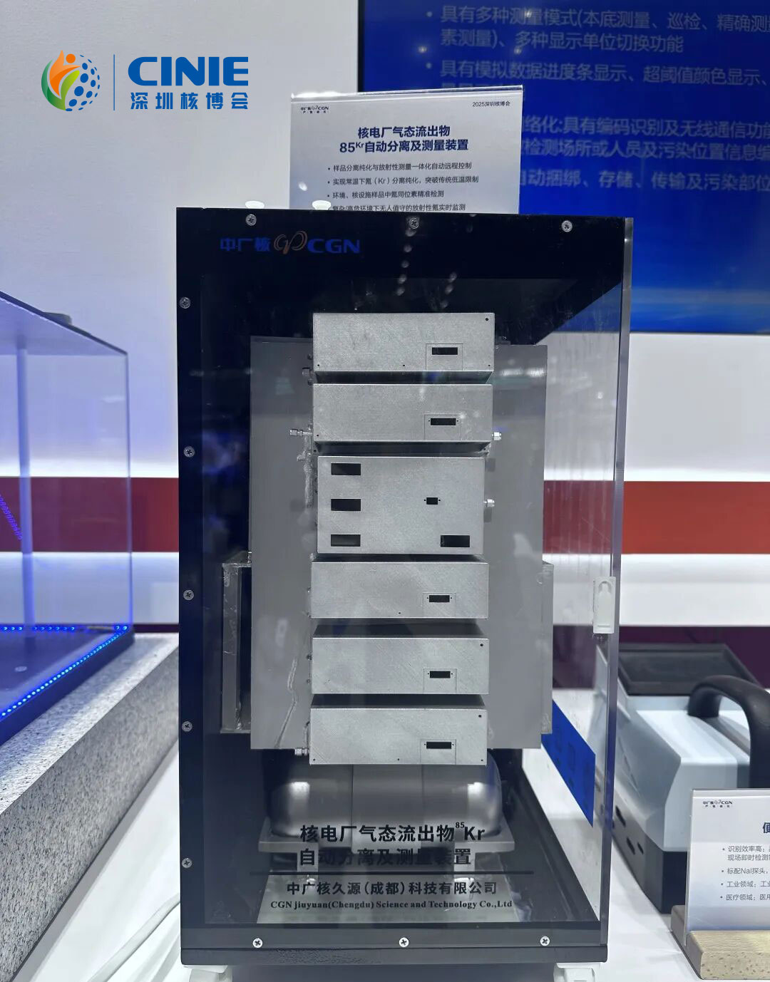 中广核久源公司携重点产品亮相展馆,包括核电厂气态流出物85Kr自动分离及测量装置、空间立体应急辐射监测系统等,充分展现了其在核测控装备研发制造领域的专业实力与行业担当。
