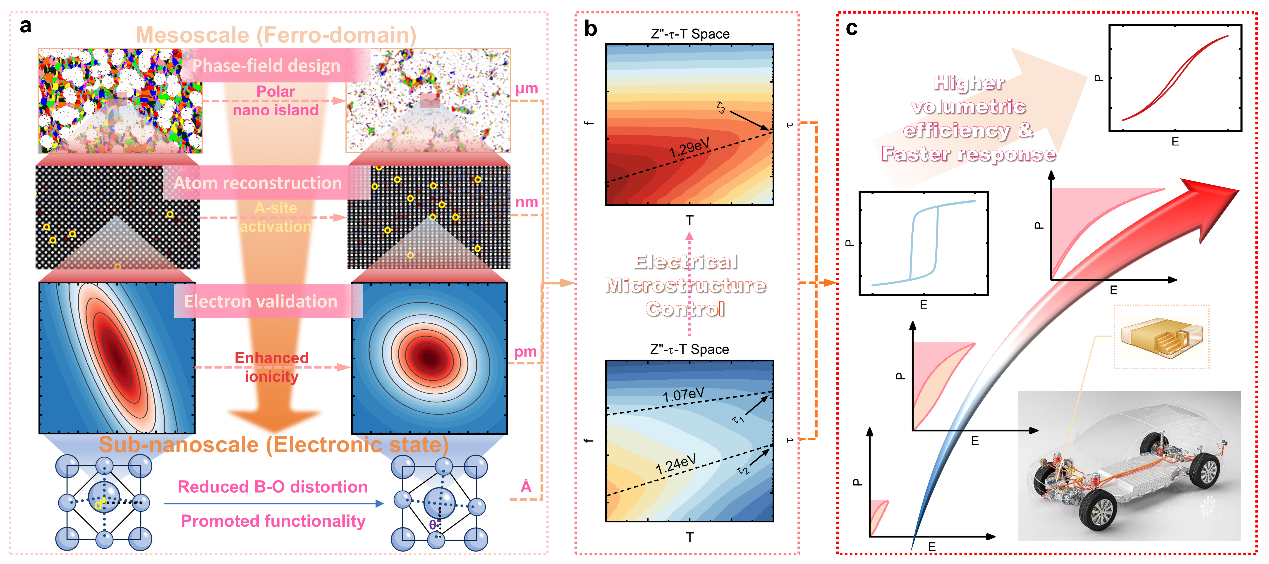 近日,西安交通大学与香港理工大学、北京理工大学等多机构联合团队在材料学顶级期刊《先进材料》(Advanced Materials)上发表题为《多极序工程实现无铅储能钙钛矿近乎理想效率》(Multi-Polar Order Engineering Enables Near-Ideal Efficiency in Lead-Free Energy Storage Perovskite)的研究论文。该研究通过多极序工程策略,成功设计出一种新型无铅钙钛矿材料NN-xBCS,在效率(η ≈ 95%)和能量密度(12 J cm-3)上刷新纪录,超越了商用含铅材料PLZT,且具备优异的温度稳定性和超快放电响应(<32 ns)。