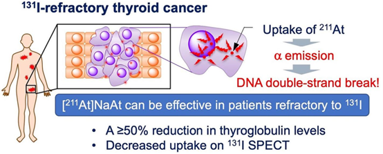 对于分化型甲状腺癌患者而言,放射性碘(RAI)疗法曾是术后复发或转移的核心治疗方案。但遗憾的是,部分患者会逐渐发展为放射性碘难治性,现有分子靶向药不仅需每日口服,还伴随蛋白尿、皮肤毒性等诸多不良反应,临床亟需更安全有效的治疗选择。Alpha-T1首次人体临床试验的研究成果为这类患者带来了新的曙光——[²¹¹At]NaAt靶向α疗法展现出优异的安全性和初步疗效,有望成为下一代治疗新选择。