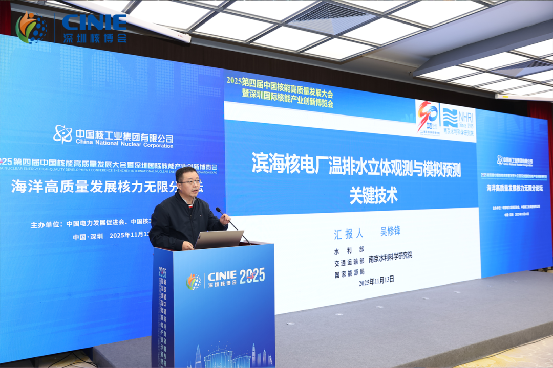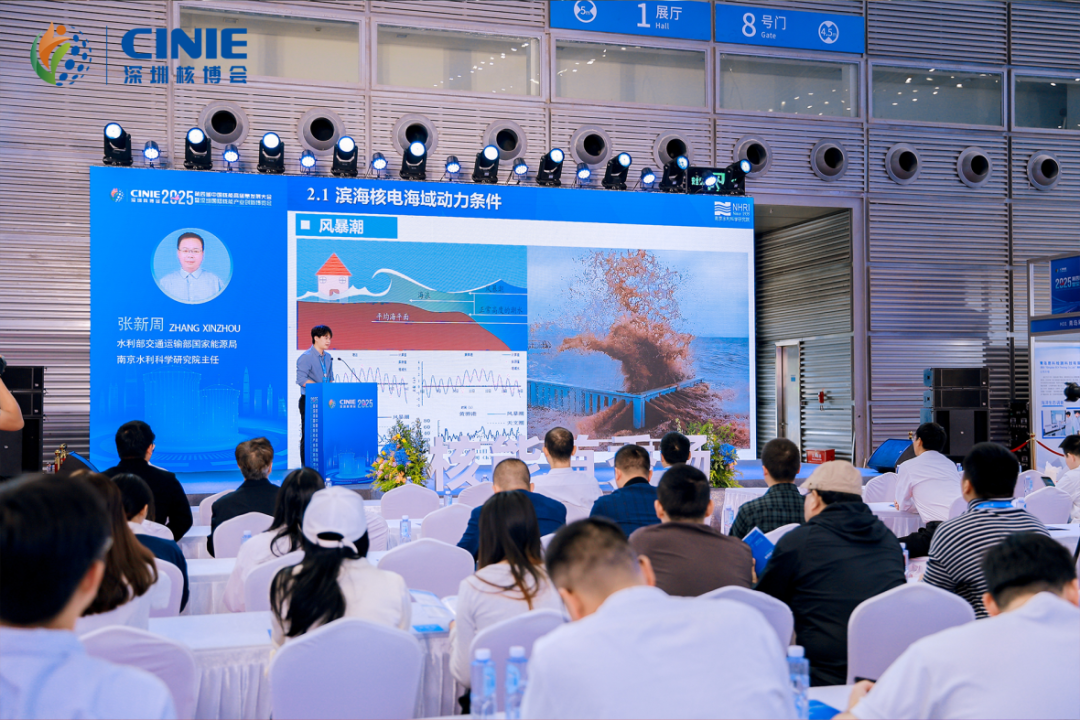 南京水利科学研究院受邀参加,并在大会上充分展示了自九十年代以来在核电工程水源保障、环境评价和安全运维等方面取得的科研成就,特别是通过论坛报告、路演、沙盘、多媒体视频、展板等多种形式,展示了近年来开展的核电冷源安全保障及取水方案优化关键技术、核电温排水影响精细预测与评估关键技术、滨海电厂排水混合井消泡关键技术、核电泵房水流特性和泥沙淤积物理模型验证、核电厂乏燃料干法贮存系统、核电海工建筑物波浪物理模型试验评估实践、核电取水泥沙积淤治理和清淤关键技术、陆海洪水叠加及厂址防洪排涝一体化计算模拟方法、钢壳混凝土结构脱空缺陷定量检测技术等十余项创新成果。