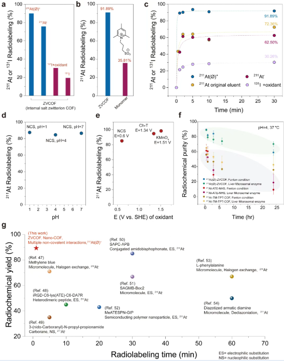 传统At-211放射性标记策略与本工作中基于²¹¹At(Ø)+非共价封装策略对比:(a)已报道的211At标记策略及CAr-At键在氧化条件下的脱砹机制;(b)根据Pourbaix图呈现的砹主要化学种态及其平衡;(c-d) 在极稀溶液中标记pmol级²¹¹At(Ø)+的示意图;(e)本工作使用ZVCOF标记²¹¹At(Ø)+的机制示意图。