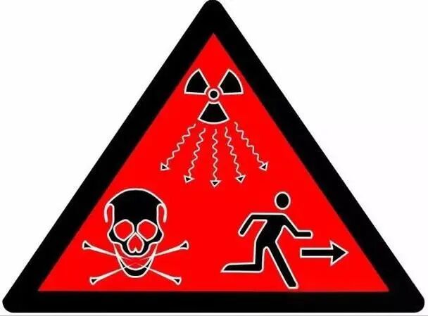 高危警示标志:红底 + 辐射波纹 + 骷髅 + 逃跑人形,仅用于危险放射源旁,看到需立即远离。