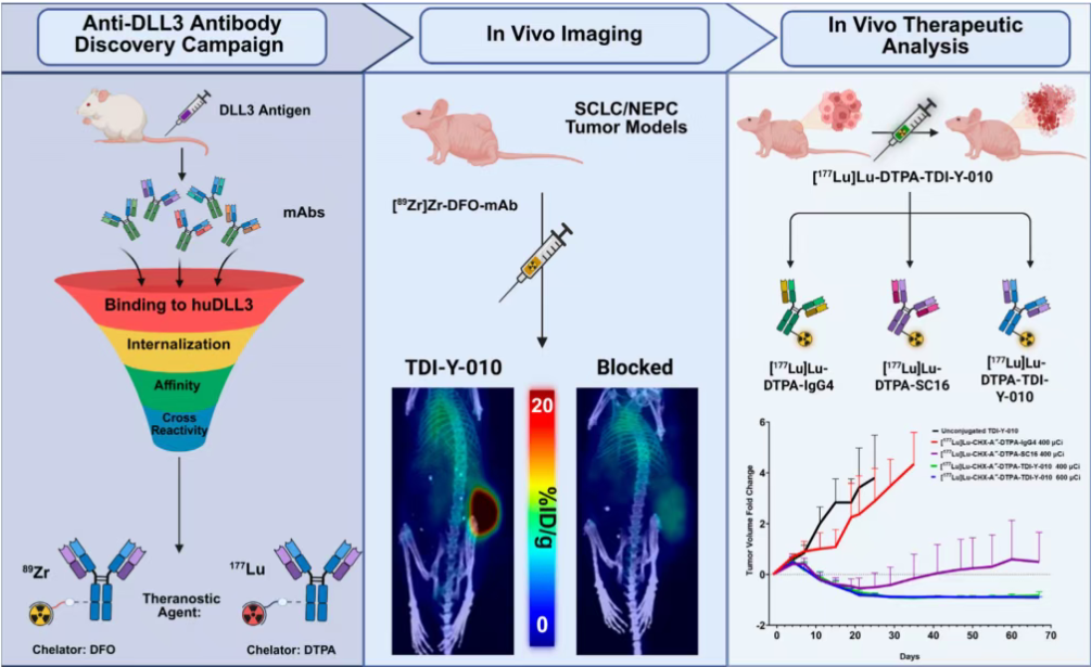 近日,一项针对神经内分泌肿瘤的靶向核药研究取得重要进展。研究团队成功开发出新型抗DLL3抗体TDI-Y-010,该抗体专为核素诊疗一体化设计,在临床前研究中展现出优异的肿瘤靶向性和治疗效果。