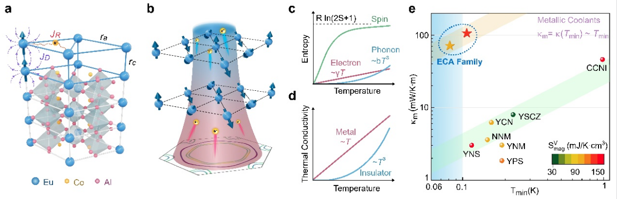 极低温是量子计算、精密测量等前沿科技不可或缺的环境。当前主流的氦-3稀释制冷技术依赖稀缺的氦-3资源,我国尚未实现自主供应,成为制约相关领域发展的瓶颈。而无氦-3固态制冷技术虽具有潜力,却因材料导热性能差、制冷功率不足而难以实用化。此项研究中发现的金属自旋超固态材料兼具强磁热效应与高导热性,既能高效制冷又能快速导出冷量,为极低温制冷提供了全新的技术路径。