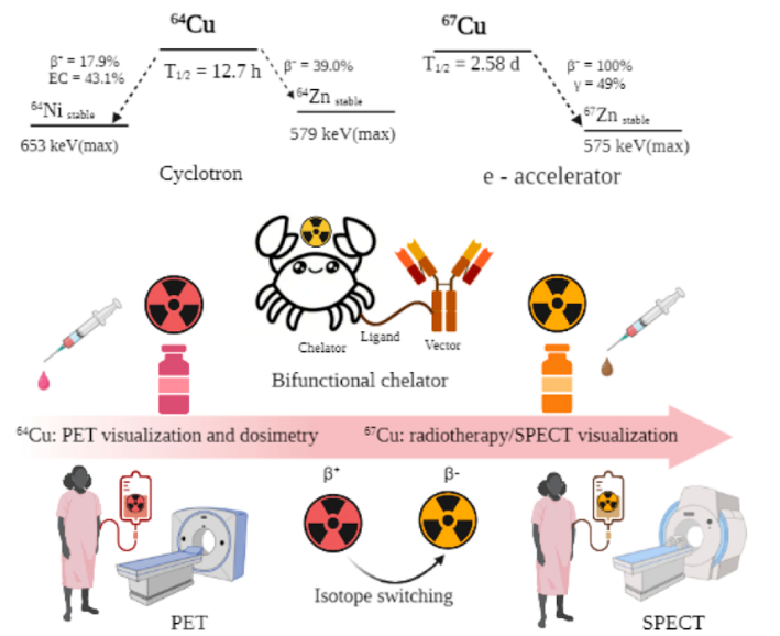 近年来,铜-64(⁶⁴Cu)与铜-67(⁶⁷Cu)因其理想的核物理与化学特性,在核医学诊疗一体化领域展现出巨大潜力。⁶⁴Cu半衰期适中、正电子能量低,PET成像质量优于⁶⁸Ga和¹⁸F;⁶⁷Cu半衰期更长,其β射线适合治疗,伴随的γ射线可用于SPECT显像监测,是放射免疫治疗的理想核素。随着⁶⁷Cu制备技术取得突破,高比活度、高纯度的稳定供应得以实现,极大推动了基于⁶⁴Cu/⁶⁷Cu诊疗一体化核素对的放射性药物研发。