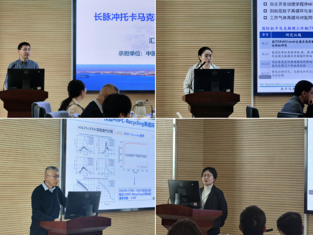 会上,各项目负责人分别作“长脉冲托卡马克粒子再循环演化机理研究”、“托卡马克粒子再循环对边界湍流和约束模式转换的影响”、“粒子再循环物理过程及其对偏滤器脱靶影响的模拟与实验研究”、“EAST长脉冲条件下杂质粒子再循环及其对等离子体约束性能的影响”专题汇报,并系统总结了2025年度项目任务指标完成情况及下一阶段重点研究计划。与会专家认真听取报告后,对各项目取得的阶段性进展给予充分肯定,并围绕长脉冲条件下粒子再循环的物理机制分析、数值模型构建、技术路线优化等关键科学问题,提出了多项具有针对性和建设性的指导意见。