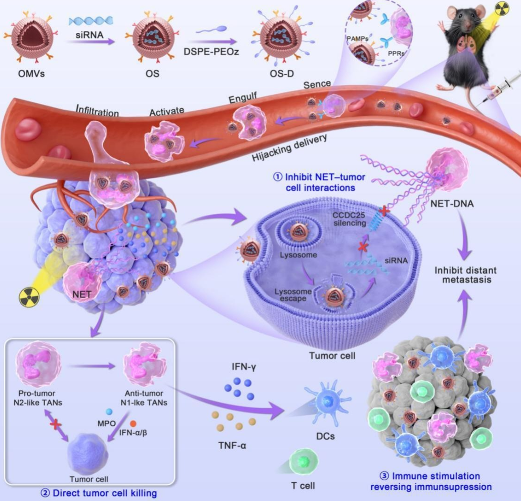 针对放疗在杀伤肿瘤的同时可能诱导炎症、招募中性粒细胞并形成中性粒细胞胞外陷阱(NETs)进而促进肿瘤远处转移的临床难题,研究团队成功构建了一种“劫持”中性粒细胞的多功能纳米平台(OS-D),将靶向CCDC25的siRNA装载进来源于大肠杆菌外膜囊泡的载体中,并用pH敏感材料进一步修饰,使其能够在肿瘤微环境中更有效地释放药物。