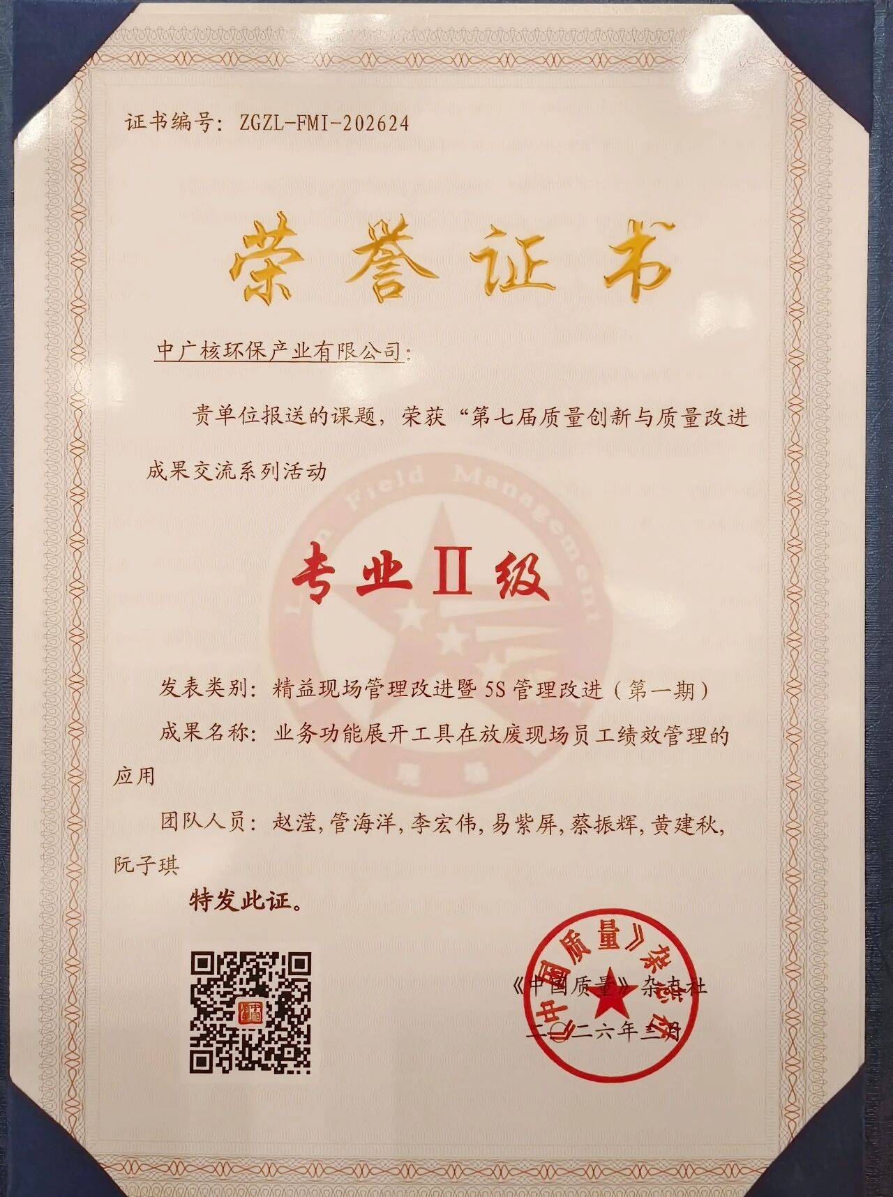 近日,在第七届中国质量创新与质量改进成果发表会上,中广核环保选送的两项实践成果《MSA在水务管理现场管网预警过程中的应用》与《业务功能展开工具在放废现场员工绩效管理的应用》,荣获“专业Ⅱ级”评价。 此次获奖,实现了公司在质量创新奖项上“从0到1”的突破,标志着公司在运用先进质量管理工具、推动业务精益化管理方面迈出关键一步。