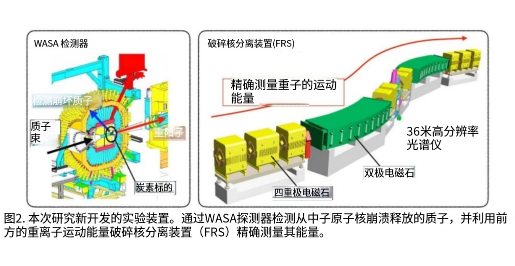 由于产生η′介子核的反应概率极小,而其他反应概率高出约100到1000倍,抑制背景事件并高效捕获η′介子核产生事件是关键。研究小组关注到η′介子核衰变会释放相对高能质子这一事实,构建了结合空间反应堆分离器(FRS)和WASA探测器的新实验装置。FRS测量向前喷射氘核的能量,WASA探测η′介子核衰变产生的质子,成功将背景事件降低至约1/400,实现了选择性探测η′介子核。