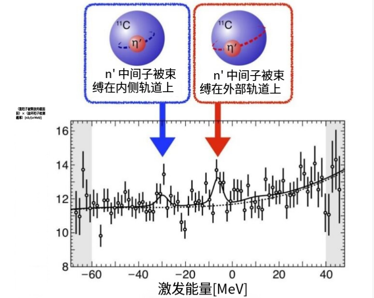 实验获得的能谱中,横轴代表碳 - 11核的激发能,纵轴代表反应截面。能谱出现的两个结构表明存在η′介子束缚于原子核不同轨道的态,暗示η′介子质量可能随核密度增加而降低。