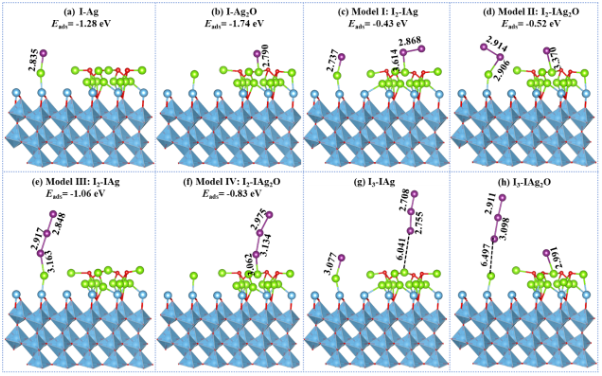 图2. 不同碘物种在吸附剂表面的优化构型:(a-b) I吸附在AT纳米复合材料表面;
