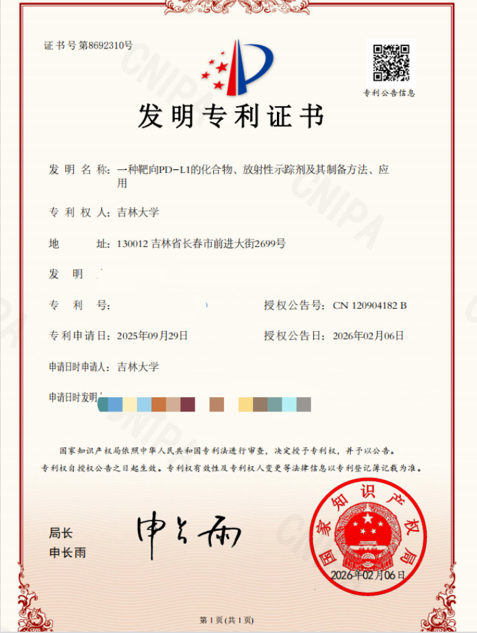 近日,吉林大学第二医院核医学科在新型放射性药物研发领域取得系列成果。该院科研团队成功获得一项靶向PD-L1放射性示踪剂发明专利,并在国际权威学术期刊上发表相关研究论文,体现了医院在肿瘤分子影像探针研发方面的创新实力。