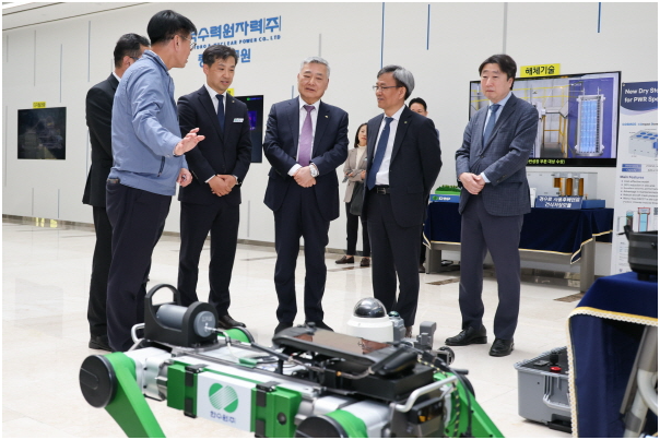 韩国水力原子能公司总裁金会天(右三)正在查看展出的研发成果