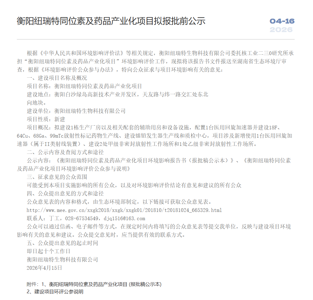 2026年4月15日,衡阳纽瑞特生物科技有限公司发布公告称,依据《中华人民共和国环境影响评价法》等相关规定,公司委托核工业二三0研究所承担“衡阳纽瑞特同位素及药品产业化项目”的环境影响评价工作,目前拟将报告书文件报送至湖南省生态环境厅审查,现根据《环境影响评价公众参与办法》向公众征求与项目环境影响有关的意见。